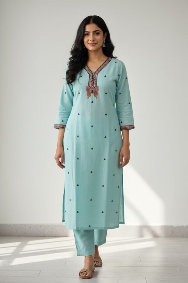 Sky Blue Cotton Embroidered Kurti with Butterfly Motif and Dupatta