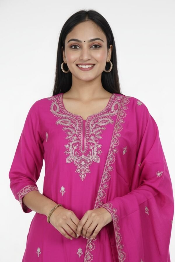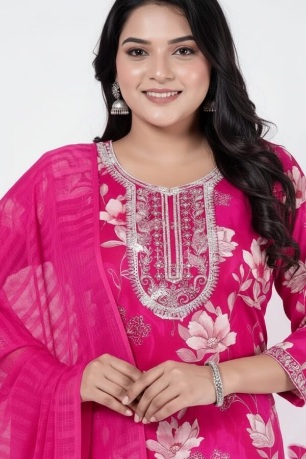 Fuschia Floral Embroidered Cotton Kurti Set with Dupatta
