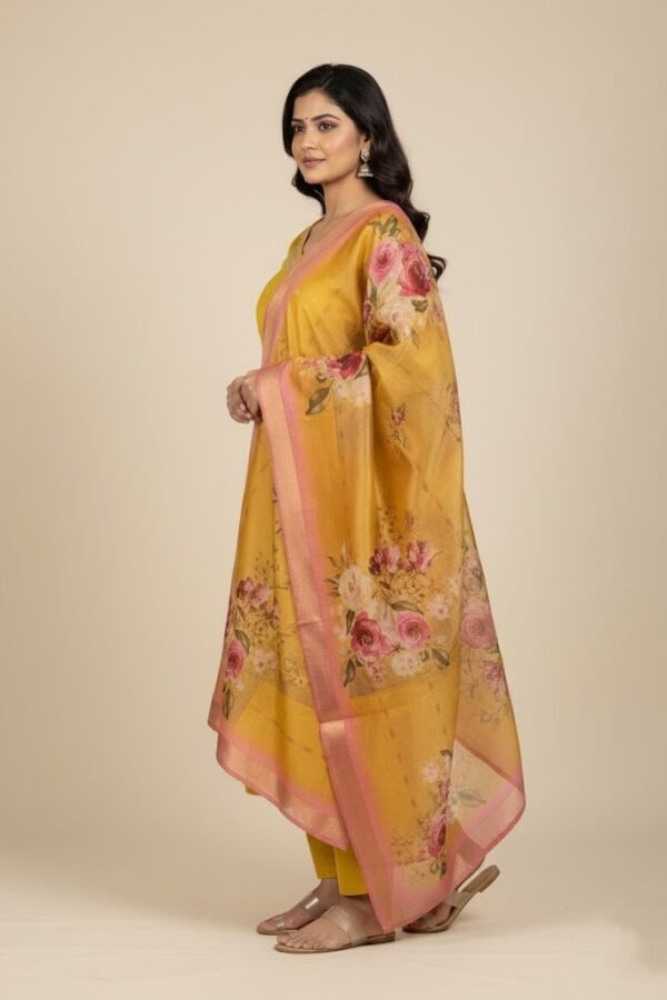Mustard Rayon Silk Embroidered Kurta Set with Floral Digital Print Dupatta