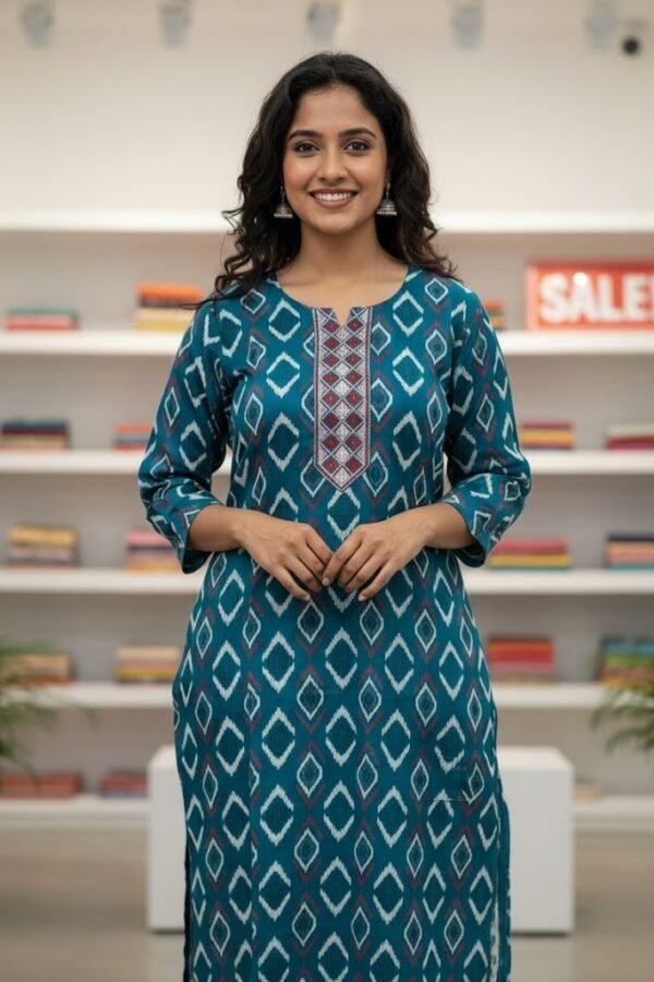 Avaasa Premium Teal Ikat Print Single Piece Rayon Kurti