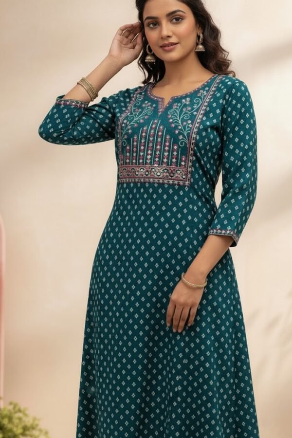 Avaasa brand Peacock Blue Jaal Printed & Embroidered Rayon Kurti