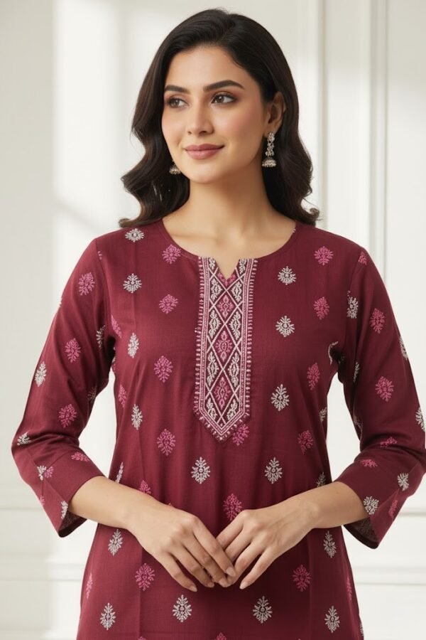 Avaasa Wine Embroidered Straight Rayon Kurti