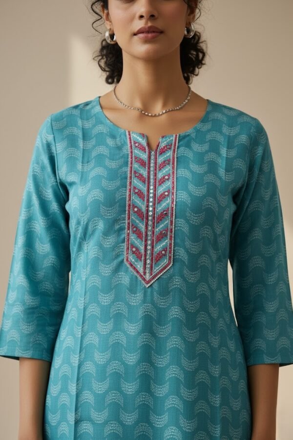 Avaasa Teal Blue Wave Print Rayon Kurti with Embroidered