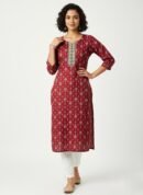 Featuring a rich maroon base, the kurti is adorned with an intricate, repeating ethnic motif print in subtle contrasting colors. The highlight is the beautifully detailed embroidered yoke in striking green and earthy tones, which adds a sophisticated focal point to the neckline.
