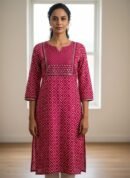 The highlight of this piece is the exquisitely embroidered yoke, featuring intricate thread work and subtle sequin detailing that adds a touch of festive sparkle. Designed with a stylish notch neckline and comfortable three-quarter sleeves, this kurti is perfect for office wear, casual outings, or small gatherings.