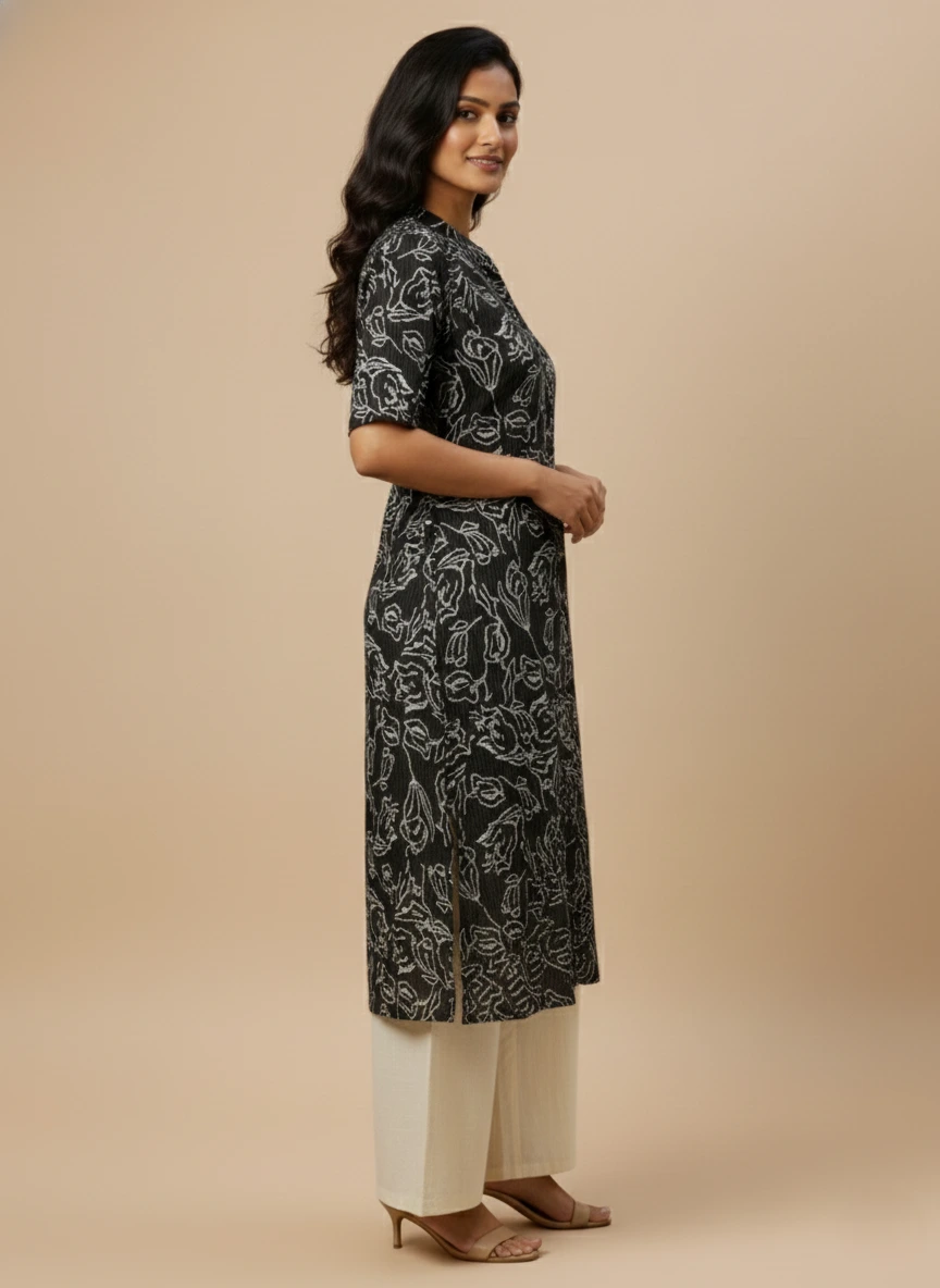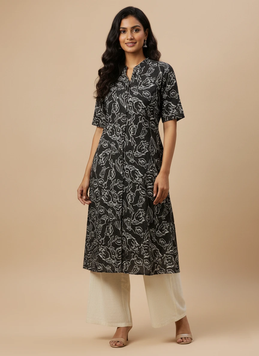 Paired with the kurta are comfortable, wide-leg palazzo pants in a contrasting light neutral/beige shade, which beautifully complements the white print and dark kurta.