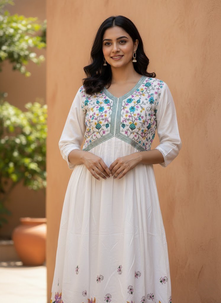 Experience the blend of traditional craftsmanship and modern elegance with the ‘Aisha’ Handcrafted Floral Embroidered Vatican Dress. Crafted from a premium, soft Vatican fabric, this maxi dress offers an exquisite, high-quality feel that drapes beautifully and ensures day-long comfort.