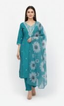 Introducing our exquisite Teal Embroidered Kurti Set, a perfect blend of traditional elegance and contemporary style. This 3-piece set, crafted from a luxurious “Vatican Fabric” (known for its smooth finish and comfortable wear), is an essential addition to your ethnic wardrobe.
