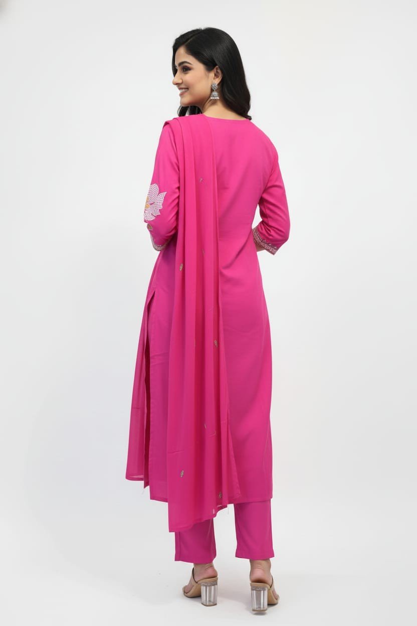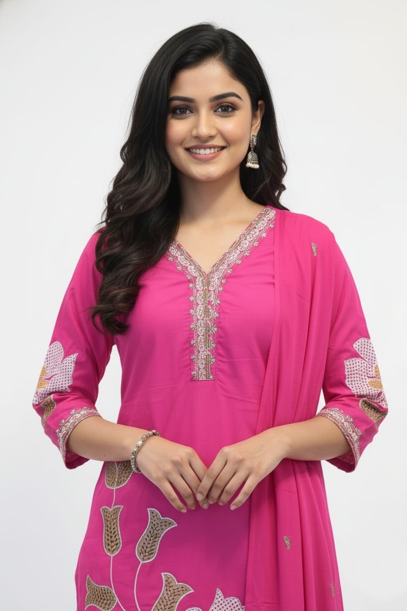 Embrace vibrant elegance with this striking Fuchsia Pink Cotton Kurta Set, perfect for festive occasions, casual outings, or everyday ethnic wear. This three-piece ensemble combines comfort with intricate artistry, making it a must-have addition to your ethnic wardrobe.