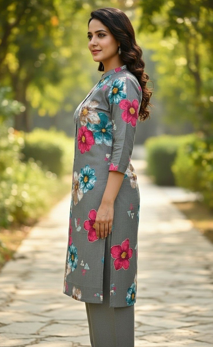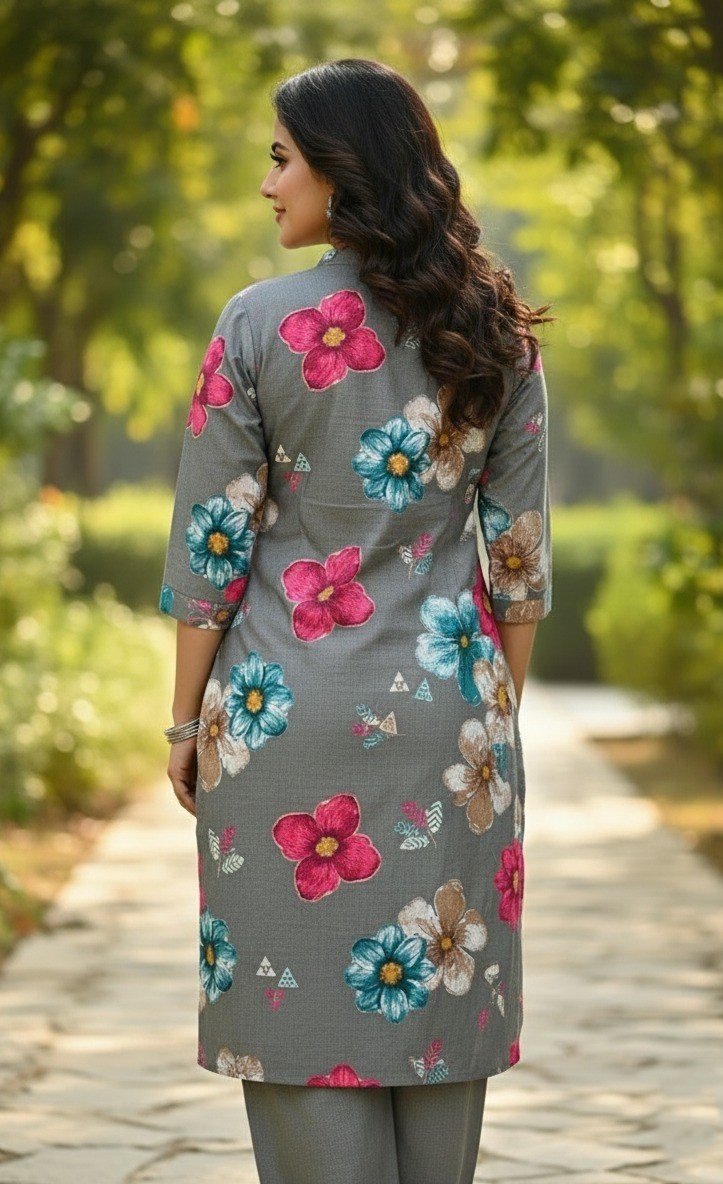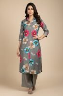 The Kurti features a contemporary Shirt Collar and a functional button-down front placket, offering a modern, polished aesthetic. The elegant 3/4 sleeves and straight cut create a flattering silhouette that suits various body types. The kurti’s base color of subtle Grey is beautifully contrasted with vibrant, oversized floral prints in Hot Pink, Teal Blue, and Beige.