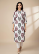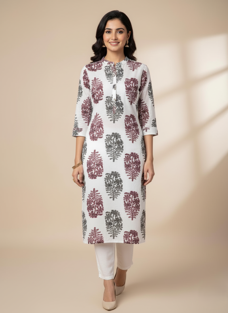 Step out in elegance with this beautiful Hand-Block Printed Cotton Kurta Set, perfect for everyday wear, office attire, or casual outings. The pristine white, straight-fit kurta features a captivating Mughal-inspired floral motif in subtle shades of Maroon and Olive.