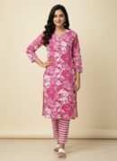 Bottom: The coordinated pants complete the look with a bold, contemporary twist. They feature a striking zigzag (or chevron) pattern in the same fuchsia and white hues, providing a chic contrast to the floral kurta. The pants are tailored for a comfortable fit, ensuring both style and practicality.