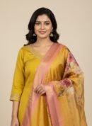 Radiate elegance in our Mustard Rayon Silk Embroidered Kurta Set. The rich mustard kurta, featuring delicate V-neck embroidery, is beautifully contrasted by a vibrant Floral Digital Print Dupatta with a stunning pink and gold Zari border. This luxurious, eye-catching ensemble is perfect for festivals and celebratory occasions.