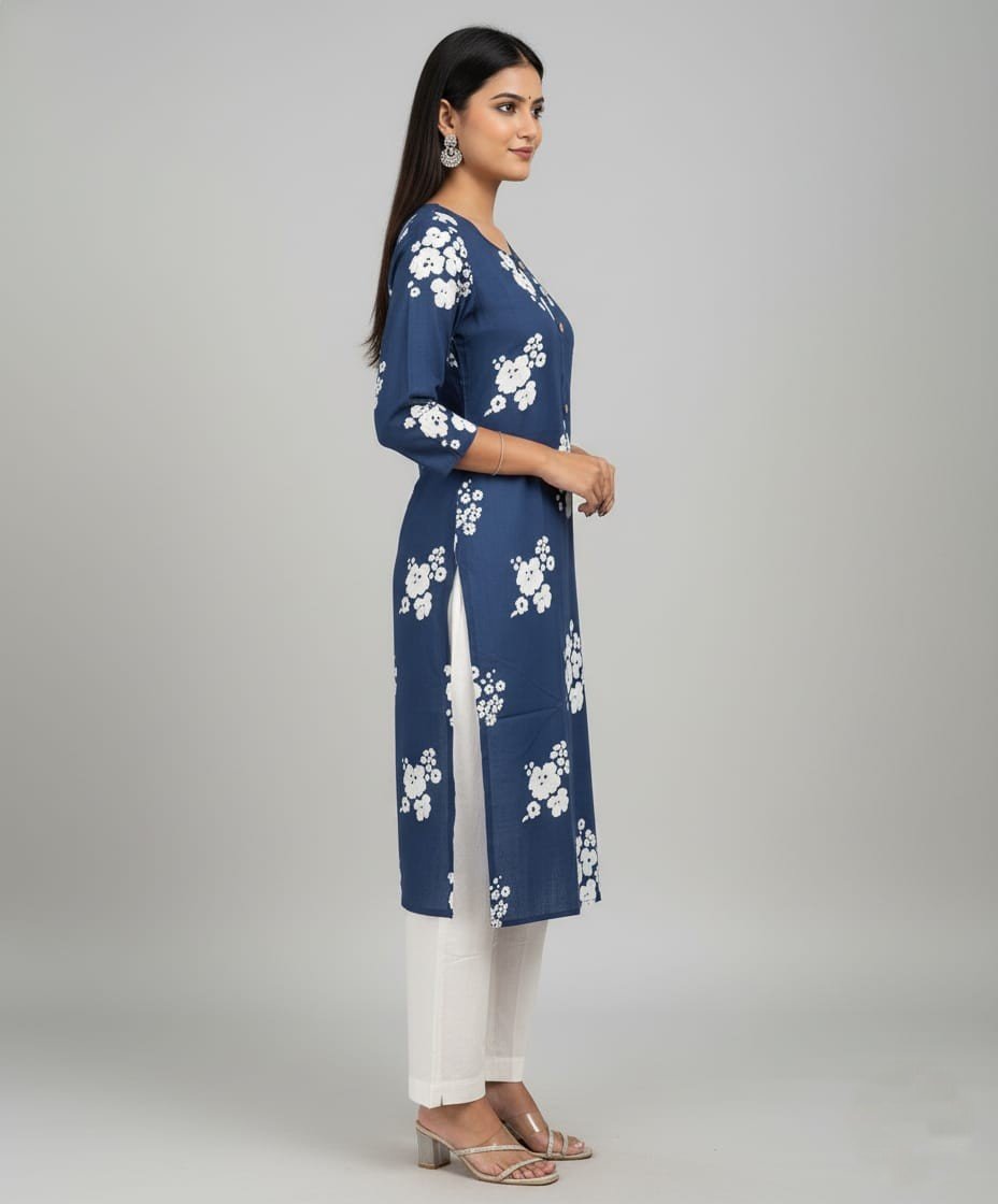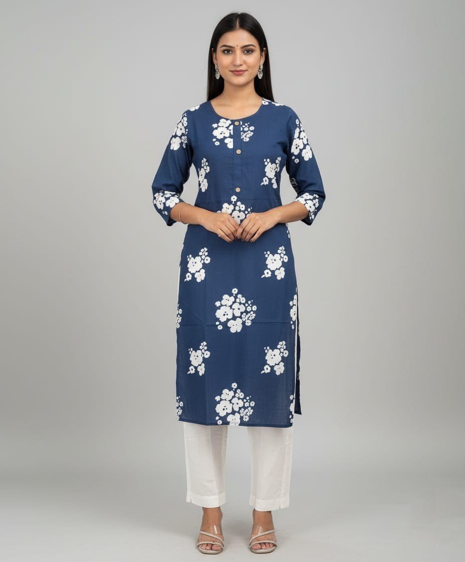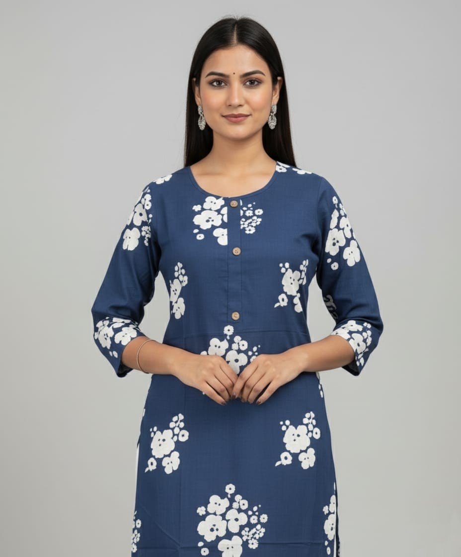 The rich navy blue base is beautifully contrasted with vibrant white floral block prints, creating a striking and sophisticated look. Designed in a flattering straight-cut silhouette with three-quarter sleeves and practical side slits, it ensures both style and ease of movement. The simple round neckline with a button placket adds a subtle, classic detail.