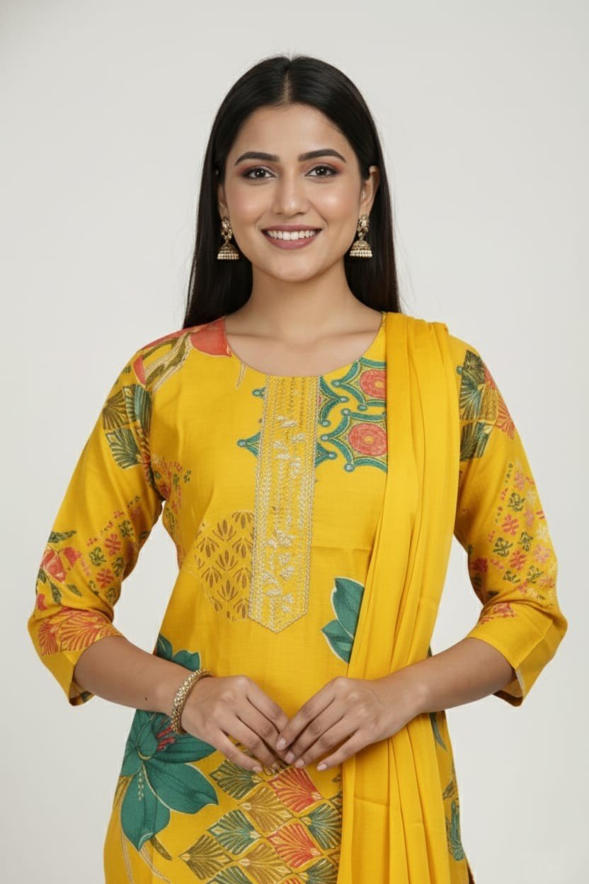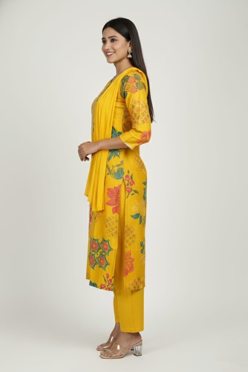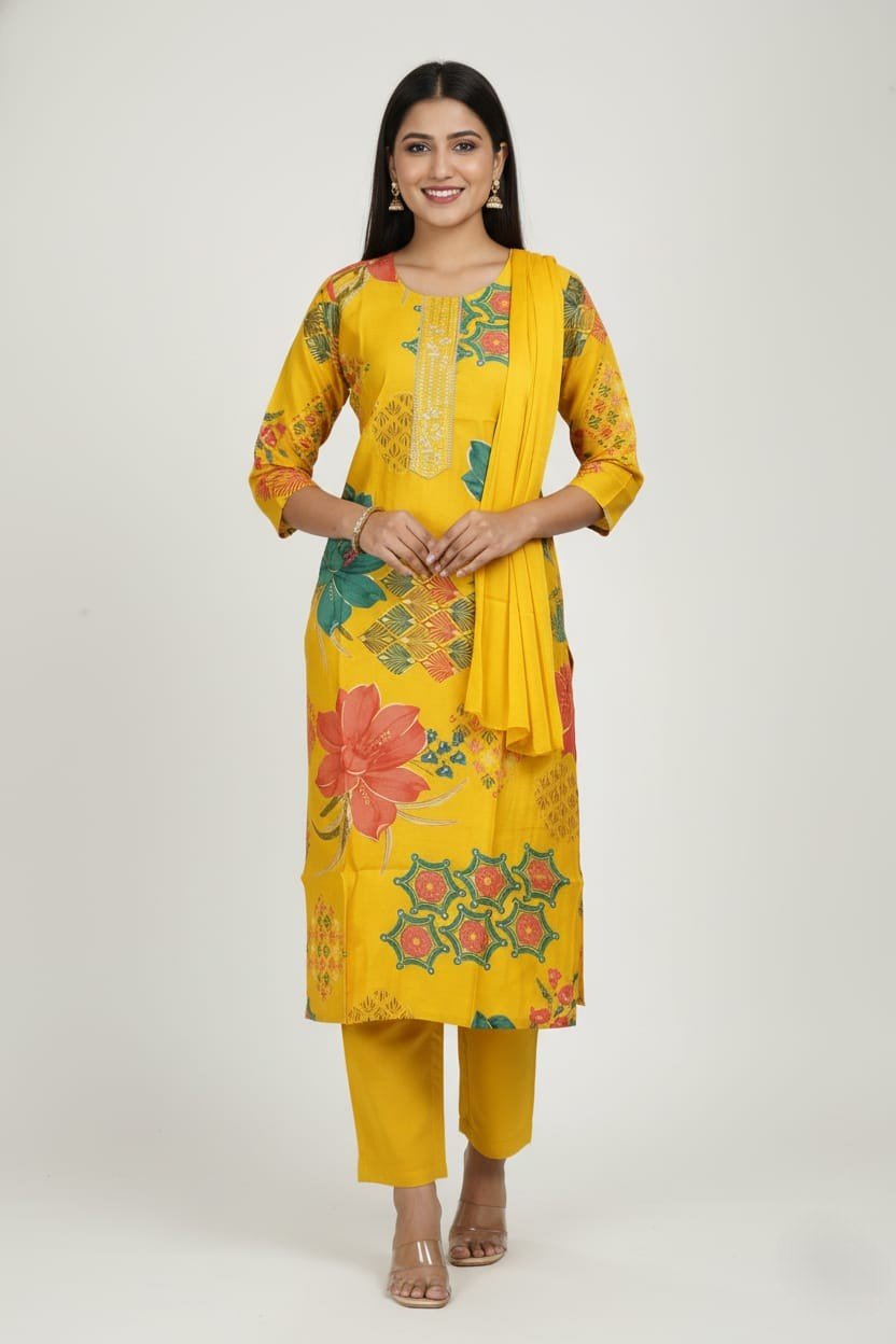 Step out in vibrant style with this beautiful Sunny Yellow Rayon Printed Kurti Set, complete with matching trousers and a dupatta. Crafted from soft, breathable rayon fabric, this ensemble is perfect for everyday wear, casual outings, or festive daytime events. The stunning blend of bold floral and intricate geometric prints gives this set a contemporary yet traditional appeal.