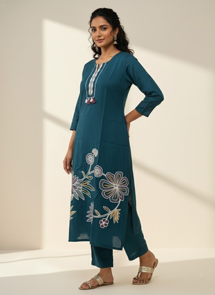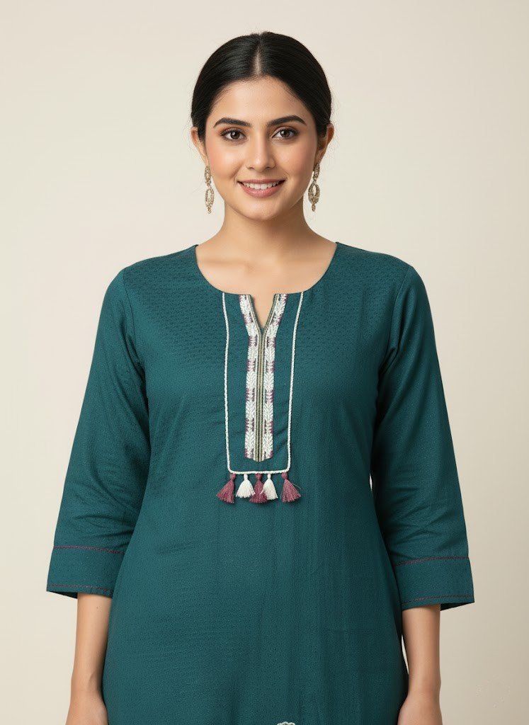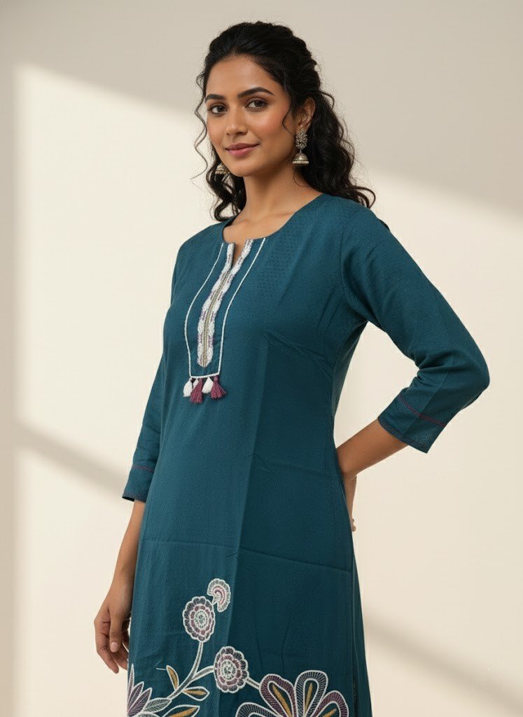 Step out in style and comfort with this exquisite Teal Rayon Kurta and Pant Co-ord Set. Crafted from soft, breathable rayon fabric, this ensemble combines traditional craftsmanship with a modern silhouette, making it perfect for both casual outings and semi-formal events.