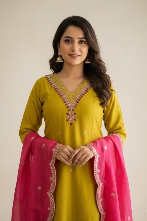 Embrace effortless elegance with this stunning three-piece kurti set, perfect for everyday wear and festive occasions alike. Crafted from breathable Cotton fabric, this ensemble combines traditional artistry with modern flair.